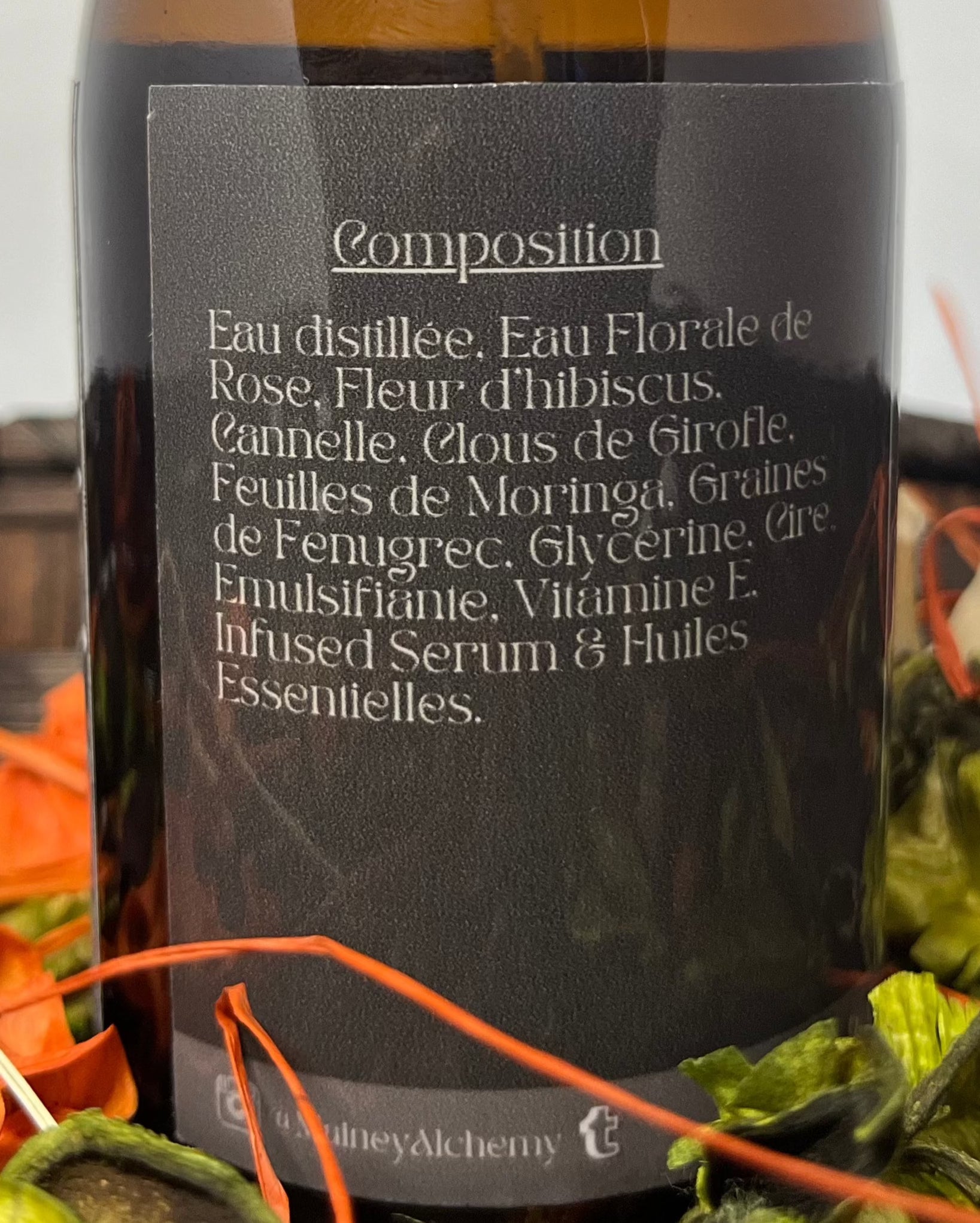Eau distillée, Eau Florale de Rose, Fleur d’hibiscus, Cannelle, Clous de Girofle, Feuilles de Moringa, Graines de Fenugrec, Glycérine, Cire Emulsifiante, Vitamine E, Infused Serum & Huiles Essentielles de Menthe-poivrée et Ylang Ylang.
